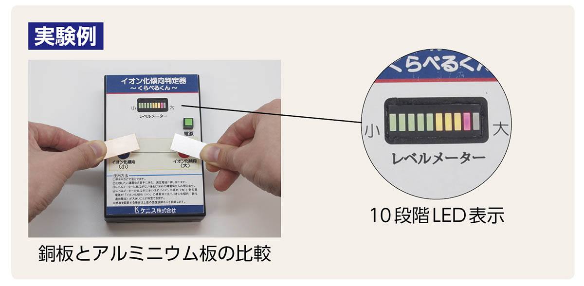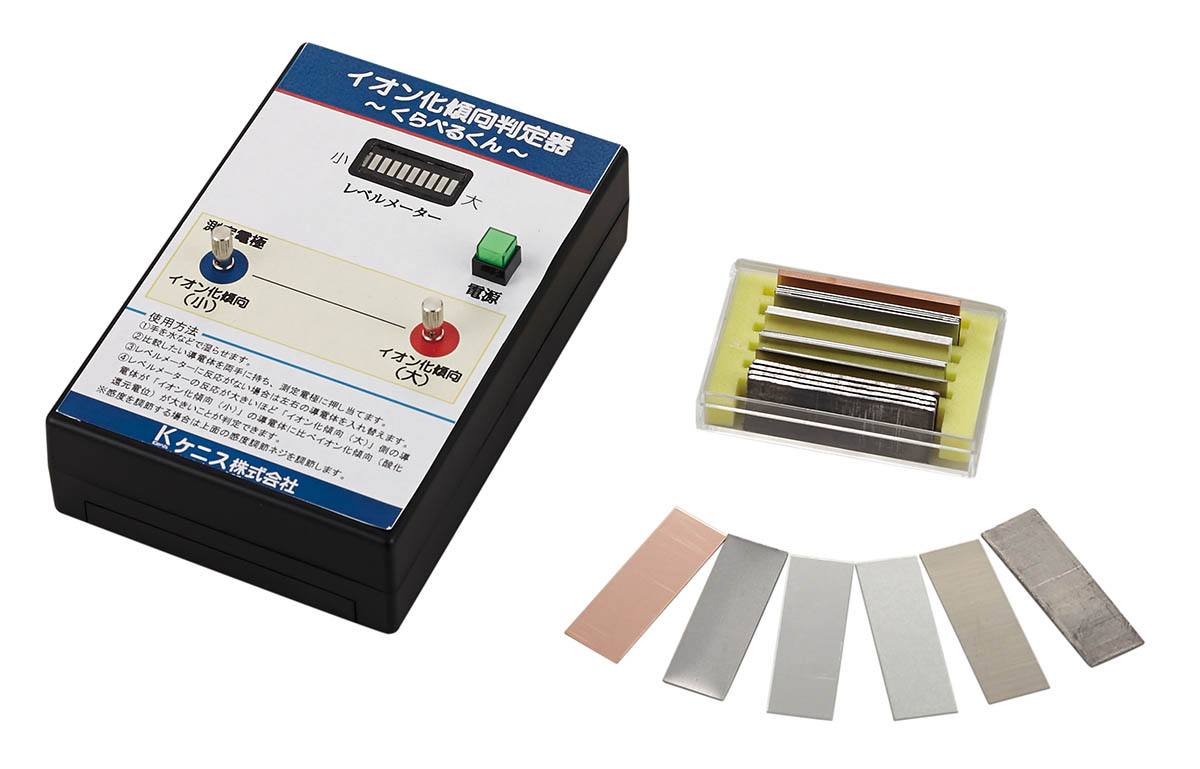 ●テスター・水溶液を一切使わず、種類の異なる金属のイオン化傾向(酸化還元電位)を簡易的に比較できる判定器です。