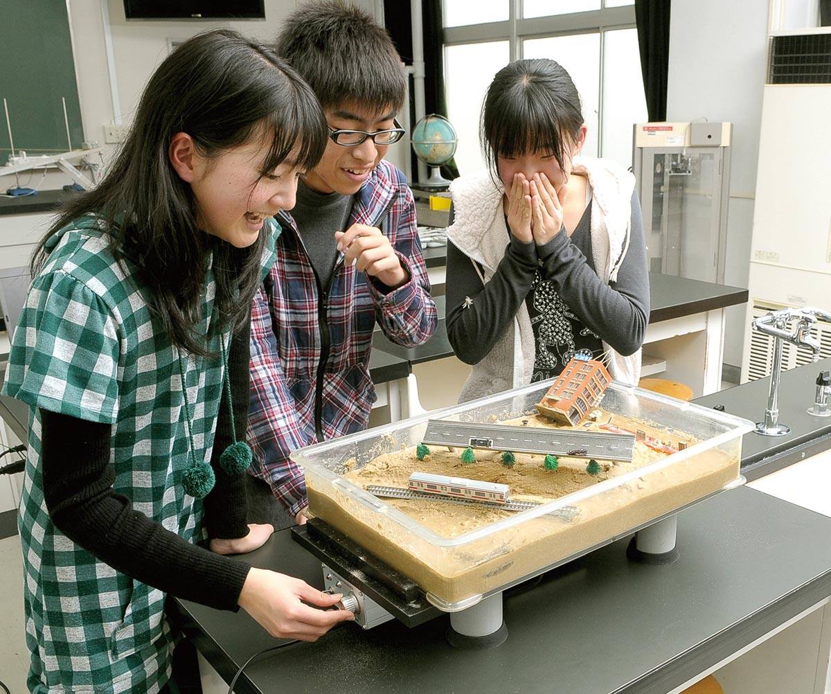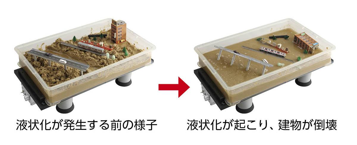 ●適量の水を含ませた砂地盤を作成し、川や山などを自由に配置し、ジオラマセットで好みの街並みを作ります。一定の振動を加えていくと、ある時点で地面から水がわき出し液状化する様子を観察できます。軽いものは浮き、重いものは沈みます。