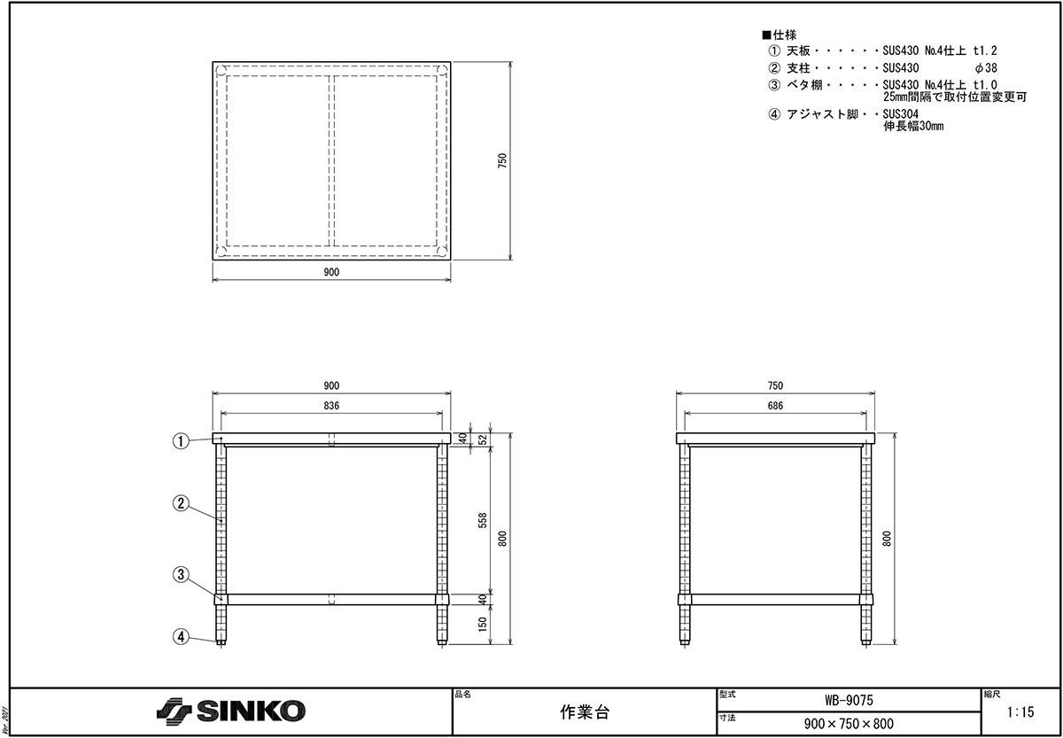 | 3-139-0291 | ステンレス作業台(ベタ棚) WB-9075 |