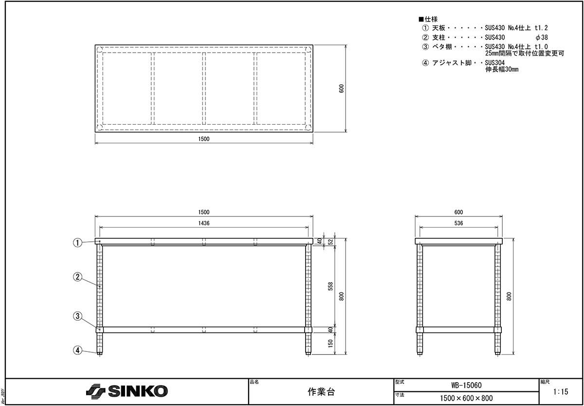 | 3-139-0294 | ステンレス作業台(ベタ棚) WB-15060 |