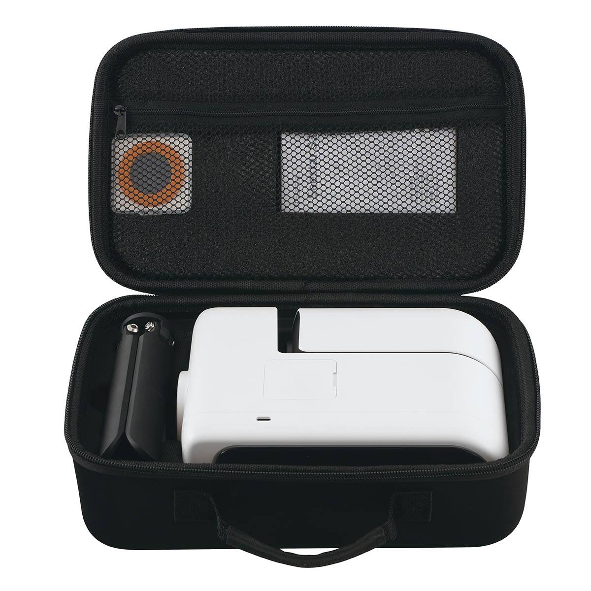 ●非常に軽量で、付属する三脚は専用ケースに収納できるため持ち運びも簡単です。バッテリーが内蔵されており、別途準備する必要はありません。三脚の水平を合わせて本体を取り付けるだけで撮影準備が完了します。