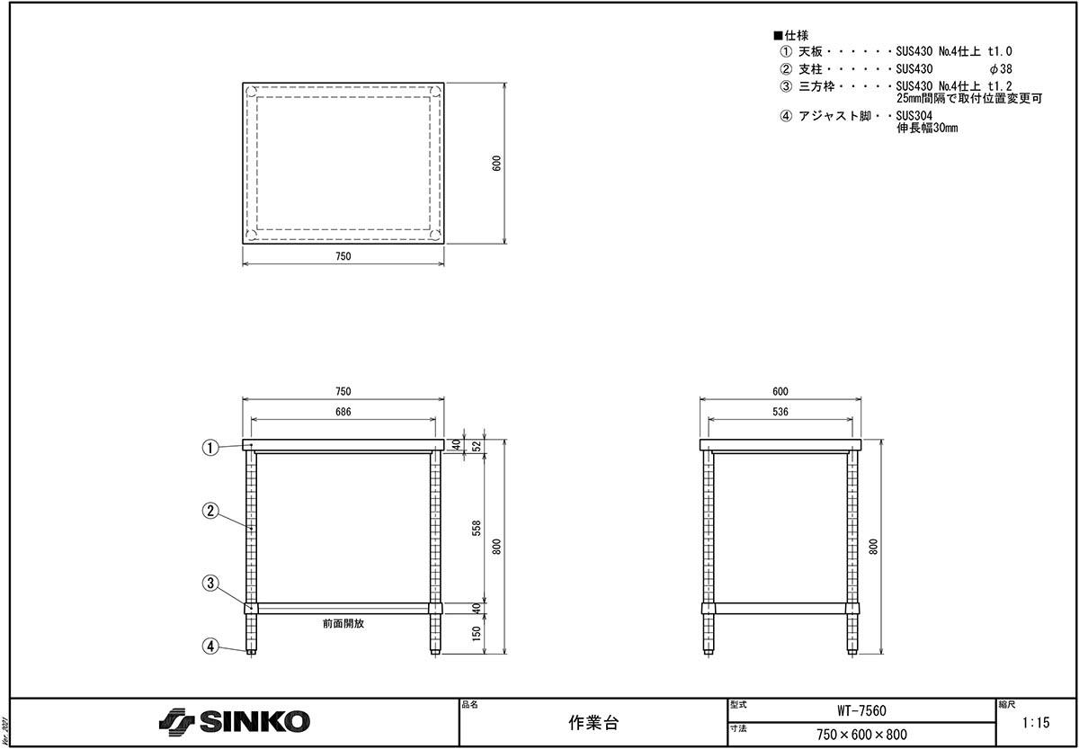 | 3-791-0011 | ステンレス作業台(三方枠) WT-7560 |